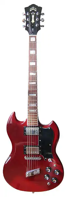 The Guild S-100 electric guitar is a lightweight solid-body guitar made by the Guild Guitar Company. It features two humbucking pickups and its body is styled similarly to a Gibson SG, but is slightly offset. In the 1970s, a version of this guitar was available from the factory with leaves and acorns carved in relief into the body of the guitar.