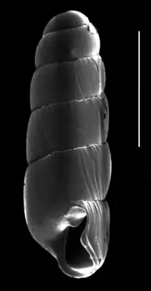 The shell is small to minute, clavate, more or less tapering, greatest width well below the middle, always more than two-and-a-half times as long as wide, transparent when fresh to whitish when worn. The umbilicus is completely closed. The spire is produced, slightly tapering or sides at most subparallel, not convex. The apex is flattened, obtusely conical to mamillate. The shell has from five-and-a-half to just under six hardly convex whorls, that are superficially smooth but under high magnification with faint spiral sculpture and growth lines, growth lines turning to weak costulation behind the labrum. Sutures are somewhat impressed, fairly shallow, simple and filiform. The aperture is subovate, sometimes distinctly squarish at base, peristome slightly incrassate and reflected, aperture not or hardly obstructed by three-fold dentition: a small angular process (usually a mere swelling), somewhat distant from and therefore not connected with apex of labrum so that there is no sinus; opposite the angular denticle there is an upper labral process in the form of a thickening of the labrum, which process does not correspond to a depression behind the labrum; finally, a very faint thickening of the lower columella may be interpreted as a columellar process.[1]