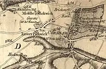 The first residents of the house were the Snelling family who built a small farmhouse. In 1678 they sold it to Edward Bayley who transformed it into a very substantial building. A sketch of this house is shown. Edward was a member of the Quakers who were very prominent in Pickwick at this time and he is listed in the Quaker burials.[2] Sometime after his death in 1707 it was sold to the Bennett family. The most likely Bennett would be Thomas Bennett who opened a Quaker Boarding School in Pickwick in about 1725.[3] After Thomas died in 1764 his son John Bennett took over teaching at the school. A map of 1773 (shown at left) shows that John Bennett owns a property called Guyers at this time. John died in 1802 and by 1813 Thomas Pycroft (1774–1849) owned the house.[4]