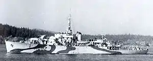 While performing an attack on a suspected target on 11 April 1945, Strathadam was damaged when one of her hedgehogs exploded prematurely, killing six of her crew. At the end of May, she returned to Canada to undergo a tropicalization refit in preparation for service in the southern Pacific Ocean.[2] This refit was begun in July and required the installation of water-cooling and refrigeration abilities and changing the camouflage pattern.[6] The refit was cancelled in August after the surrender of Japan and Strathadam was paid off 7 November 1945. She was laid up at Shelburne, Nova Scotia.[2]