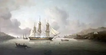 ![]() HMS Enchantress in the River Dart, 1804, by Charles Martin Powell. Britannia Royal Naval College | |