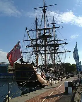 The idea of building a replica of Endeavour was first mooted by the trustees of the under-construction Australian National Maritime Museum.[2] The vessel would serve as the centrepiece of the museum ship fleet.[3] Funding for construction was provided by the Bond Corporation, with the completed replica to be presented as the company's gift to Australia for the nation's bicentenary.[3] Construction was organised through a subsidiary company, Endeavour Replica Pty Ltd.[3] A specialist shipyard was established at Fremantle Fishing Boat Harbour; a viewing gallery allowed visitors to observe the replica's construction, and volunteer guides ran tours through the shipyard.[3] Recreation of the vessel was not problematic, as the original Endeavour had been surveyed multiple times by the Royal Navy, particularly during her conversion from a cargo collier to a ship of exploration, and these records had been retained by the British National Maritime Museum.[4][5]