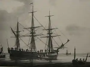 At the beginning of December, the ship sailed from New York to Savannah, Georgia to assist in the attack on that city. Despite dismounting her main armament, the ship had to keep one or more pumps running continuously during the voyage to prevent her from sinking. She arrived at Savannah on 28 December, after the British had secured the city.[7] Her 9-pounder guns were ordered removed when she was reclassified as a 20-gun armed transport on 22 December.[2] Throughout 1779, Vigilant supported British operations along the coasts of Georgia and South Carolina, despite running aground several times. Lacking substantial repairs during this time, the ship's condition deteriorated until her crew refused to take her to sea from Beaufort, South Carolina on 28 February 1780 to support the planned siege of Charleston. She was then surveyed and condemned as "utterly unfit for sea"[7] and decommissioned on 9 April.[lower-alpha 3] Her crew and armament were loaded aboard the transport Margaret & Martha and taken to Charleston where they were transferred to the transport Margery,[lower-alpha 4] which had been purchased and renamed Sandwich to serve as Vigilant's replacement.[9] Vigilant was burnt at Beaufort sometime later that year.[10]