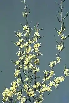 The erect loose non-lignotuberous shrub typically grows to a height of 2 to 4 metres (6.6 to 13.1 ft).[3] The branchlets have a patchy covering of pale rusty-brown coloured hairs. The flat curved evergreen leaves have a linear to narrowly obovate shape with a length of 5 to 14 centimetres (2.0 to 5.5 in) and a width of 3 to 14 millimetres (0.118 to 0.551 in) and have three or rarely four longitudinal veins.[4] It blooms from September to November and produces white-yellow or white-pink flowers.[3] Each solitary inflorescence contains 25 to 40 flowers with a creamy coloured perianth and a cream pistil with a length of 4.5 to 6.5 mm (0.177 to 0.256 in). After flowering an obliquely narrowly ovate, curved and prominently beaked fruit is produced which is 2 to 2.5 cm (0.8 to 1.0 in) in length and 7 to 10 mm (0.276 to 0.394 in) wide. The fruit contain narrowly ovate shaped blackish brown seeds with a wing down one side.[4]
