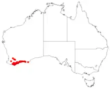 Rusty hakea is found in a small area in the Wheatbelt and an area along the south coast of the Great Southern and Goldfields-Esperance regions of Western Australia where it grows in sandy, rocky loam or clay soils.[3] The shrub is often part of mallee heath or open forest communities.[4]