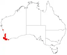 It is endemic to an area in the South West and Great Peel regions of Western Australia from Armadale in the north to Denmark in the south where it is found in damp areas and ridge tops growing in sandy-loam and gravelly soils.[2] It is often found as part of the understorey in jarrah forest communities.[3]