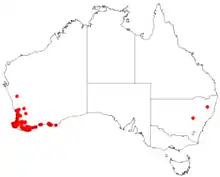 Furrowed hakea is endemic to an area in the South West, Great Southern and the Goldfields-Esperance regions of Western Australia from Gingin in the north to Albany in the south, Augusta in the west and Esperance in the east. It grows in sandy or clay soils over or around areas of laterite.[4]