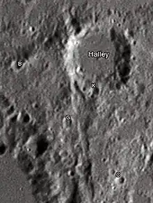 - ↑ "Halley (lunar crater)". Gazetteer of Planetary Nomenclature. USGS Astrogeology Research Program.