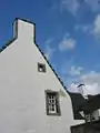 Hamilton House comprises a two-storey main block with projecting wings at either end.[3] The date 1628 (or 1626) appears in a panel above the former main entrance,[5] with the initials IH and KS representing Sir John Hamilton, Lord Magdalen, and Katherine Sympson, while thee three pediments of the dormers have the Hamilton's coat of arms, their impaled initials and the date 1628, as well as the arms of Katherine Sympson.[3] The exterior is harled and whitewashed, has chamfered stone edges and crow-stepped gables,[2] known in Scots as corbie-stepped.[3] The chimney stacks have stripped quoins.[2] The house has a hexagonal stair tower which stands in the corner of the main block with south wing and which contains the main entrance, above which is the inscription "Praised be the Lord My Strenth and My Redeimer",[1] while at the other end of the main block there is a round conical roofed, corbelled-out turret. The house has a steep roof tiled with stones. When the road outside was widened an outbuilding and a passageway were demolished, reducing the size of the courtyard. The adjacent road is also around 500mm higher than the original dirt road, from when the surface was macadamed in the 19th century. The interior of the building has been completely re-ordered in relation to its original form.[3]