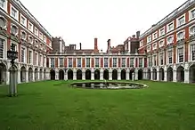 In the early 1690s, King William III's massive rebuilding and expansion work, which was intended to rival the Palace of Versailles, destroyed much of the Tudor palace.[3] His work ceased in 1694, leaving the palace in two distinct contrasting architectural styles, domestic Tudor and Baroque. While the palace's styles are an accident of fate, a unity exists due to the use of pink bricks and a symmetrical, if vague, balancing of successive low wings.[4] King George II was the last monarch to reside in the palace.
