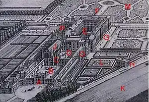 The grounds as they appear today were laid out in grand style in the late 17th century. There are no authentic remains of Henry VIII's gardens, merely a small knot garden, planted in 1924, which hints at the gardens' 16th-century appearance.[56] Today, the dominating feature of the grounds is the great landscaping scheme constructed for Sir Christopher Wren's intended new palace. From a water-bounded semicircular parterre, the length of the east front, three avenues radiate in a crow's foot pattern. The central avenue, containing not a walk or a drive, but the great canal known as the Long Water, was excavated during the reign of Charles II, in 1662. The design, radical at the time, is another immediately recognizable influence from Versailles and was indeed laid out by pupils of André Le Nôtre, Louis XIV's landscape gardener.[30]