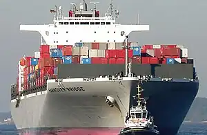The ship carries containers, which is the fastest-developing sector in cargo shipping. Hannover Bridge was built in 2006 in the ship-yard of IHI Marine United in Kure, Hiroshima, Japan.[1] The ship can carry 8,212 TEUs, according to company requirements, but IMO claims that the vessel's capacity is larger than ten thousand. The operator of Hannover Bridge is the container shipping sector of K Line Group, which maintains a fleet of 55 container ships. The gross tonnage of Hannover Bridge is 98,747, the ship's length is 336 metres, and its beam is 46 metres.[2]