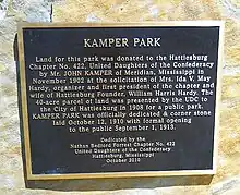 The 40 acres (16 ha) for Kamper Park was donated to the Daughters of the Confederacy by John Kamper in 1902, and was given in turn to Hattiesburg in 1908 for a public park. The zoo was opened on about 12 acres (4.9 ha) of the 40-acre (16 ha) park in 1950.