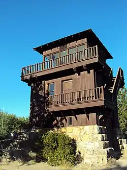 One of two examples of the National Park Service Rustic style built in Yosemite, the Henness Ridge Fire Lookout is a three-story structure. On the lowest level, this version has a garage with room for one vehicle. The mid level is an office/bunk area with a 360 view of Yosemite and the surrounding Sierra National Forest. Atop this level is an upper observation area, with an overhanging roof. It is smaller than the underlying office level to provide a walkway around the periphery.