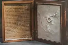 The framed model says 1851…It may have been replicated for the 1851 world exposition. transcribed from the noted publication (5)...under notices and abstracts, in 1850: On a Model of the Moon's Surface, By Henry Blunt. This model is an accurate representation of a part of the Moon's surface as it appears through a Newtonian telescope of seven feet focus and nine-inch aperture, under a magnifying power of about 250. The large volcanic crater, which forms the principal object in the model, has received the name of Eratosthenes. It is about thirty miles in diameter and stands at the end of a lofty range of mountains not far from the centre of the Moon's disc. A hilly district, rising into two or three lofty peaks, runs upwards from Eratosthenes, connecting it with what appears to have been an ancient crater now filled up. Touching the edge of this crater and descending from it towards the right, may be seen a long line of minute volcanic cups, which are nearly the smallest objects visible with the instrument by which the observations were made. The whole is represented as seen with an inverting eye-piece, and the model ought to be held in an oblique light in order to view it to advantage.