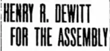 - ↑ "Henry R. DeWitt for the Assembly". The Kingston Daily Freeman. October 13, 1915. Retrieved 18 June 2018.