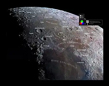 - ↑ The geologic history of the Moon. USGS Professional Paper 1348. By Don E. Wilhelms, John F. McCauley, and Newell J. Trask. U.S. Government Printing Office, Washington: 1987. Table 12.2.