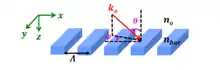 Schematics of high contrast grating. Λ, grating period; ko, incident light wave vector; nbar, refractive index of grating bar; no, refractive index of the surrounding medium of the grating bar.