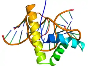 ![]() NMR structure of the HMG-box domain of the LEF1 protein (rainbow colored, N-terminus = blue, C-terminus = red) complexed with DNA (brown) based on the PDB: 2LEF coordinates. | |||||||||||