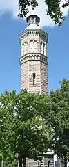 The High Bridge Water Tower, in the park between West 173rd and 174th Streets, was built in 1866–1872 to help meet the increasing demands on the city's water system. The 200-foot (61 m)-tall octagonal tower was designed by John B. Jervis in a mixture of Romanesque Revival and neo-Grec styles, and was accompanied by the 7-acre (2.8 ha) Highbridge Reservoir. The High Bridge system was inaugurated in 1872, and reached its full capacity by 1875.[47] With the opening of the Croton Aqueduct, the High Bridge system became less relied upon; during World War I it was taken out of service when sabotage was feared.[47] In 1949 the tower was disconnected from the system,[47][69] and a carillon, donated by the Altman Foundation, was installed in 1958.[47] The tower's cupola was damaged by an arson fire in 1984. The tower and cupola were rehabilitated and restored in 1989–1990.[47] The High Bridge Water Tower was designated a New York City landmark by the Landmarks Preservation Commission in 1967. The High Bridge Water Tower underwent a 10 year, $5 million renovation, and reopened to the public for scheduled tours in November 2021. [70] Tours are free through NYC Parks Department and usually take place several times a month.