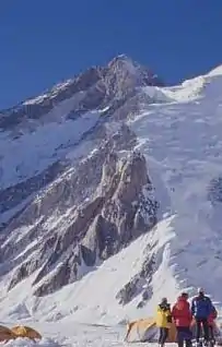 In this report the northern and highest point of the massif is called Kabru III (first ascent May 1994) and the central, median height peak is called Kabru North. The latter may have been climbed as early as 1883. - ↑ Yashima, Hiroshi (1988). "Cho Aui Expedition 1986". Himalayan Journal. 44.