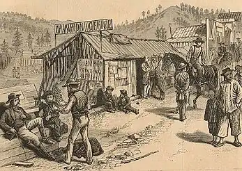 Despite intense oppression at the time, Chinese immigrants in Deadwood experienced less discrimination than in other parts of the United States.[14] However, some groups still expressed negative feelings towards the group of immigrants. Towards the later half of 1877, changes in the mining labor industry were taking place. Rather than working independently, corporate-owned mines were contracting labor. The Black Hills Times reported that "500 Chinese are expected to start arriving daily."[32] Reports like these evoked racist reactions from the mining community, who saw the Chinese as a direct threat to their financial stability. It was a common perception that these immigrants were willing to work for fewer wages than the typical mining salary of $4 to $7 of that day.[33] This tension led to the first organizational resistance in March 1878. J.O. Reed held a large gathering and created the first Caucasian League in the Black Hills, intent on protecting "white interests."[1][34] The League was supported by the Miners Union and they repeatedly gave speeches expressing their disinterest with the continued immigration of the Chinese to the Black Hills.[1] On one occasion, they stated during a speech that "bills have been presented in Congress to regulate the immigration of Chinese to this country, and for the benefit of our working classes, we hope they will pass."[35] Additionally, woodworking industry members voiced complaints about the Chinese workers who were participating in their industries.[36] Each group protested the Chinese immigrants through speeches, public displays of protest, and creating committees that would try to provide ultimatums to Chinese workers and their employers.[1]