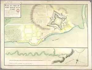 In 1605, France founded Port-Royal on the Annapolis Basin.[1] This colony was raided by the English in 1613 and was the site of a short-lived Scottish colony at Charles Fort from 1629. By 1630, urban structures existed to the east of the fort. The area was ceded back to France in 1632. The principal thoroughfare, Saint George Street, was distinct by 1686. After numerous attacks, claims of ownership and changes of control, the town was finally ceded to the British in the Peace of Utrecht of 1713. The town was renamed Annapolis Royal and served as the capital of the colony of Nova Scotia until it moved to Halifax in 1749. Subsequently, the town drew its living from ship building, brick making and forestry.[3]