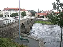 The Falkenberg Bridge was built in the mid 18th century. The current town hall (Falkenbergs town hall) was built in 1826, although earlier town halls had existed at the same spot.