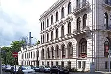 The C. F. Peters Music Publishing House, built in 1900 and owned by Henri Hinrichsen, thrived in one of the leading locations for German music publishing; Leipzig.[36] Henri, a successful businessman and philanthropist soon became a target of discrimination and exclusion carried out by the Berufs- und Standesorganisationen der Musikverleger (Music Publisher's Association). After many years of pressure and discrimination, only 17 approved "Jewish" music publishers still existed in Germany, one of those being C. F. Peters. On November 10, 1938, however, chaos reached an extreme as the firm's headquarters was ransacked and the music was burned.[31] A little over a year later, on November 15, 1939, Henri and his son Hans were expelled and a forced "aryanization" of the company began.[36] The process was executed by SS regiment leader Gerhard Noatzke and in July 1939, a sales contract was finalized and the property, along with its buildings such as the Peters Music Library, were sold for one million Reichsmarks. Henri, his wife Martha, and their son Hans soon unsuccessfully attempted to emigrate to the United States and instead, after his wife and son had died in Brussels and Perpignan respectively, Henri was deported to Auschwitz and later murdered.[31][36]