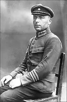 Hnat Stefaniv (Ukrainian: Гнат Стефанів; born 2 May 1895 died 21 June 1949) was a colonel of the Ukrainian Galician Army and the army of the Ukrainian People's Republic. Born in the village of Toporivtsi near Horodenka, Stefaniv rose to the rank of major in the Austro-Hungarian army. In the November retreat of 1918, he was the organizer and commandant of the Zolochiv area in the Western Ukrainian National Republic. In 1918, he was elevated to the rank of colonel and commanded the Ukrainian Army in Lwów. Under his leadership, the Ukrainian forces fought the Polish forces in Lwów, but after the arrival of reinforcements were forced to leave the city November 22. Later he joined the army of the UNR where he commanded the Hutsul regiment, the additional brigade of the rifleman's division and the commander of the cavalry in the First Winter Campaign. In 1920 he became the commander in exile of the Ukrainian armies. In 1920 he went over with a group under General Anton Kraus to Czechoslovakia and there headed the diplomatic mission of the West Ukrainian People's Republic in Uzhhorod. Until 1939 he lived in Transcarpathia, then in Vienna, and from 1944 - in Germany, where he died.