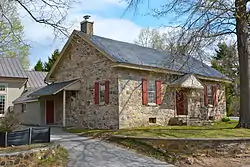 The meeting house was built in 1738 and enlarged in 1745.[4] In 1973 it was a one-story, white plastered stone building with a gable roof.[5] Photographs taken in 2014 show the plaster has been removed from the stone. It has a gable roof with projecting cornice and a crown moulding at the roof line. The other contributing buildings are a stable and a frame storehouse and a stone house dated to 1817. The contributing site is the cemetery.[5]