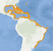 Queen angelfish are found in tropical and subtropical areas of the Western Atlantic Ocean around the coasts and islands of the Americas. They occur from Florida along the Gulf of Mexico and the Caribbean Sea down to Brazil. Their range extends as far east as Bermuda and the Saint Peter and Saint Paul Archipelago.[1][6] Queen angelfish are benthic or bottom-dwelling and occur from shallow waters close to shore down to 70 m (230 ft). They live in coral reefs, preferring soft corals, and swim either alone or in pairs.[6]