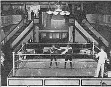 At various times the theatre was known as: The New Royal Amphitheatre (1867); the Royal Amphitheatre and Circus (1867); the Grand Cirque & Amphitheatre (1873); the National Amphitheatre (1873); Newsome's Circus (1874); the Holborn Amphitheatre (1874) - under the management of John Hollingshead; the Grand Central Skating Rink (1876-7); Hamilton's Royal Amphitheatre (1878); the Royal Connaught Theatre (1879); the Alcazar Theatre (1882); The International Theatre (1883), and the Holborn Theatre (1884). The venue ceased to perform live theatre in 1886, after which it was variously called The West Central Hall; Holborn Stadium, the National Sporting Club[5] and The Stadium Club.[1][2] It was here at the Holborn Stadium in 1907 during the Tommy Burns-Gunner Moir fight that Eugene Corri became the first British referee to officiate inside the boxing ring, while as The Stadium Club the venue became a popular boxing venue and was the setting for a match in Hitchcock's film The Ring (1927), although the scene was probably filmed on a set at Elstree Studios.[6]