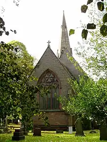 The church is surrounded by a large churchyard which is still used for burials. The initial area closest to the church, known as the 'Old Ground', opened with the church in 1852. Since then the churchyard has been extended several times and now covers approximately seven acres in an irregular shape.