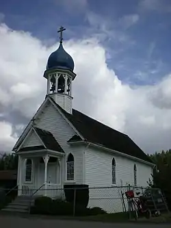 Holy Trinity Orthodox Church is a historic church in Wilkeson, Washington. The church was founded by Eastern European Slavic immigrants from the Carpathian Mountains of eastern Czechoslovakia.[2] It was built in a Gothic Revival style and was added to the National Register in 1989. Holy Trinity Orthodox Church is the oldest Orthodox church in Washington State. The building is a simple design that blends the lines of an American Gothic meetinghouse with the onion dome and interior iconography of the Slavic Orthodox faith. The church has served the Eastern European community across the mining towns of eastern Pierce County.[3]