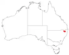 This homoranthus grows in heath and woodland on volcanic ridges on the Northern Tablelands of New South Wales.[2]