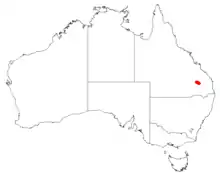 Found in a small area north of Chinchilla Queensland. Grows on deep sandy soils in heath and shrubby woodland on flat terrain.[5]