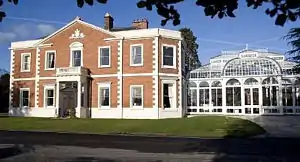 Extensive additions were made to it in the 19th century including an elaborate cast iron conservatory.[1][2] The conservatory was not designed by Thomas Harrison in about 1820, as some have stated. He in fact designed the one at Hoole House. The Hoole Hall conservatory does not appear in illustrations until after 1850.[4] During the 20th century it was used by Western Command Army Division to house the Pay Corps and later abandoned and became derelict, but was then converted into a hotel.[1][2] It is constructed in plum-coloured brick, with stone dressings and a Welsh slate roof. Its plan is square, plus a servants' wing. The west wing has two storeys, is symmetrical, sits on a stone plinth, and has rusticated quoins.[1] Figueirdo and Treuherz describe it as "a miniature astylar Palladian villa of brick with stucco dressings".[2] The house is recorded in the National Heritage List for England as a designated Grade II listed building.[1]