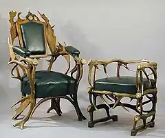 Antlers were already used in the late 15th century as a source material for clothes hooks, storage racks and chandeliers, the so-called "lusterweibchen".[2] Furniture made by antlers have been invented in the 19th century and can therefore be assigned to the Biedermeier period.[3] They were exclusively made for the European nobility to decorate their hunting castles and various manors. Historically mentioned horn furniture was developed in the year 1825 for a hunting castle of the count William of Nassau near Wiesbaden, Germany, A photograph of 1890 is the single existing evidence as the castles was destroyed in World War II and the interior furniture is regarded as lost. Further known collections of historic horn furniture are credited with the hunting room in the country estate of the Brandhof of the Archduke Johann of Austria or the antler collection of count Arco in Munich, Germany. Many other examples of horn furniture of that time can only be found with drawings and pictures, e.g. Joseph Danhauser (1780–1829) an Austrian furniture manufacturer left hundreds of drawing and another well-known aquarelle is the dressing room of Ferdinand Baron von Hildprandt.[4]