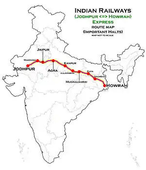 The 12307 / 12308 Howrah–Jodhpur Express is a Superfast Express train belonging to Indian Railways that runs between Howrah Junction and Jodhpur in India. It operates as train number 12307 from Howrah Junction to Jodhpur and as train number 12308 in the reverse direction. This train is regarded as one of the most high priority and a highly respected train in Howrah to Jodhpur route. This train is also the fastest train in Howrah to Jodhpur route with an 140kmph top speed.