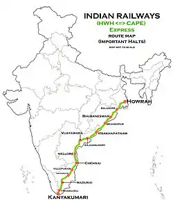 The train numbered 12665 leaves Howrah at 16:15 hours every Mondays[8] and arrives Kanyakumari at 10:50 hours on Wednesdays.[9] On the return journey, the train leaves Kanyakumari at 05:30 hours every Saturdays[10] and arrives Howrah at 23:55 hours on Sundays.[11][lower-alpha 2] Some of the prominent stoppages includes Kharagpur, Bhubaneswar, Visakhapatnam,Rajahmundry, Eluru,Vijayawada, Ongole, Chennai Egmore, Viluppuram Junction, Tiruchirappalli Junction, Madurai Junction, Tirunelveli Junction and Nagercoil Junction.