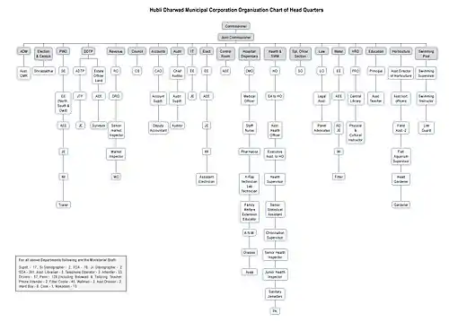 The total area under HDMC is 213 km2. The twin cities are currently divided into 82 wards. Each ward elects a corporator. The winning party elects a council of members, who are responsible for various departments. The council members chose the Mayor among themselves. At present, there are sixty seven members[6] in the council. The Commissioner is the highest officer of Municipal Corporate Office, who is responsible for the departments of public works, revenue and tax, water supply, planning and development, fire brigade, health and sanitation, finance and accounts etc. The current Municipal Commissioner is Ishwar Ullagaddi (KAS)[7] while presently the municipal council is under animated suspension pending election of new members.