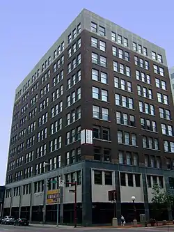 The building is a steel framed structure covered in brick. It is a ten-story building that rises 151 feet (46 m) above the ground.[2] The building was designed by the Des Moines architectural firm of Proudfoot, Bird & Rawson and completed in 1913. F. M. Hubbell, Son, & Company, Inc., a real estate firm established in 1887, had the building constructed. Their corporate headquarters that oversaw their various companies was located here. Most of the building was rented out to other firms.[3] It was designed by the prominent Des Moines architectural firm of Proudfoot, Bird & Rawson. Originally, the building had a more ornate appearance, but in the late 1940s part of the cornice fell onto sidewalk prompting its removal in 1948. It was replaced them with smooth concrete panels. The Des Moines architectural firm Brooks Borg, who designed that project also designed the simplification of the building's storefront level in 1950. In the later project, panels of dark green stone replaced terracotta pilasters, and cast concrete panels replaced terracotta window surrounds on the second floor and glass transoms on the first floor. The building was connected to the Des Moines skywalk system in 2002.