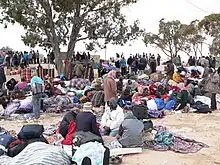 Migrants were also stranded elsewhere in Libya, such as in the southern towns of Sebha and Gatroum. Of the two thousand Chadian migrants who were trapped in Sabha and Qatrun, nearly forty percent were women, children and the elderly who had been living under difficult conditions in the open southern Libyan Desert.[24] Evacuations by air organized by the IOM began early July.[25] Whilst waiting for evacuation, Chadians were provided with food, water, hygiene materials and medical assistance by the IOM and the Libyan Red Crescent.[24]