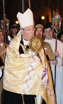 The humeral veil is one of the liturgical vestments of the Roman Rite, also used in some Anglican and Lutheran churches. It consists of a piece of cloth about 2.75 m long and 90 cm wide draped over the shoulders and down the front, normally of silk or cloth of gold. At the ends there are sometimes pockets in the back for hands to go into so that the wearer can hold items without touching them with the hands.[1]