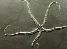 More than 260 animal species have been described from the Hunsrück Slate. The deposits occur in a strip some 15 km wide and 150 km long running from northwest to southeast. In the main depositional basins of Kaub, Bundenbach, and Gemünden, echinoderms are concentrated in the southwestern area around Bundenbach, with brachiopods predominating in the northeast. The presence of corals and trilobites with well-developed eyes and the rarity of plant fossils from the central basin areas suggest a shallow-water environment. Other animal fossils include sponges, corals, brachiopods, cephalopods, ctenophores,[2] cnidarians, gastropods, and worm trace fossils.[5] Trilobites and echinoderms are relatively abundant in some horizons. Crinoids and starfish are the predominant representatives of the echinoderms, although holothurians (sea cucumbers) are also represented. More than 60 species of crinoids are described from the Hunsrück Slate.