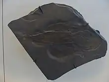 Many types of fishes have been described from the Hunsruck slate. Several genera of placoderm armoured fish have been recorded, including some preserved in three dimensions.[6] Agnathan jawless fishes are the most commonly preserved vertebrates, particularly the flattened Drepanaspis, notable for its upwards-facing mouth, and the streamlined Pteraspis. Spines from acanthodii[7] spiny sharks and a single sarcopterygian lobe-fin specimen are also known.[8][5]
