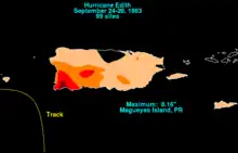 This article incorporates text from this source, which is in the public domain. - 1 2 3 John V. Vaiksnoras (October 11, 1963). The Affects of Hurricane "Edith" to Puerto Rico and Virgin Islands September 26–27, 1963. United States Weather Bureau (Report). National Hurricane Center. p. 3. Retrieved August 21, 2013.