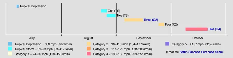 The season's first storm had limited reported impacts on land, and the subsequent system caused more severe damage in southern Texas and northern Mexico. Hurricane Three dropped torrential rainfall on Puerto Rico before striking the same region as the previous cyclone. Hurricane Four bypassed Bermuda to the east, where some property damage was reported. Hurricane Five was the most catastrophic storm of the season, buffeting western Cuba for an extended period of time as it slowly executed a counterclockwise loop. Death tolls from the hurricane are estimated in the hundreds.