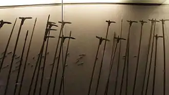 One weapon specifically-mentioned in "Hymn to the Fallen" is the variously-translated ge (Chinese: 戈; pinyin: gē; Wade–Giles: ko. (Note that the two Chinese words and characters for ge -- weapon and song -- are distinct.) Translations include dagger-axe, pike, halberd, and others (dagger-axe is descriptive, the others tend to be the names of European relatives. This long, polearm weapon generally consists of a metal blade or blades and sometimes a metal point hafted at the end of a long pole, generally of wood. Eventually these ge were mass-produced, the spear tip on the end became more common and the ji became commonly used (Chinese: 戟). The ge was known in China from earliest history through the time period when "Hymn to the Fallen" was written. Ge made in Wu (吳戈) or produced from steel made there were especially renowned, and specifically mentioned in "Hymn to the Fallen".